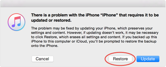 4. Passe a su ordenador, habrá una ventana de diálogo que le pedirá actualizar o restaurar tu iPhone, haga clic en el botón “Restaurar”, entonces se comienza a restaurar el iPhone bloqueado con contraseña.