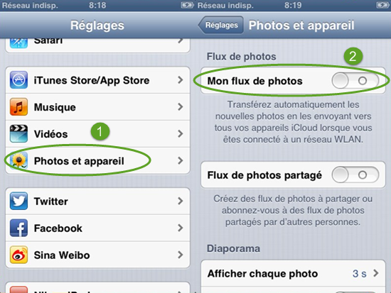 – Mettre en place Mon flux de photos: Allez dans Réglages> iCloud> Photos (ou Réglages > Photos et appareil photo)> Activer Mon flux de photos.